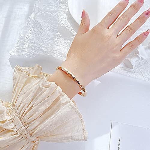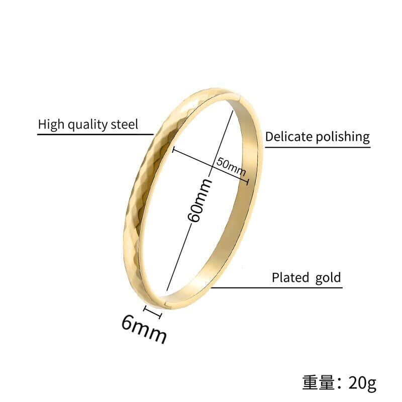【多面カットのバングル】多面に刻まれたカットが光を反射し、手元に立体感を与えるデザインで、シンプルながら印象的なアクセサリーです。 【Deelfel ブレスレット】ステンレス素材を使用し、シルバー・ゴールド・ピンクゴールドの3色展開。内径約60mm×50mm、幅6mm、重量約20gのワンタッチ仕様のユニセックスバングルです。 【使用場面】結婚式、誕生日、母の日、披露宴、成人式、プロポーズ、エンゲージ、結婚式お呼ばれ、普段使い、春夏秋冬、オールシーズン、ホワイトデー、バレンタインデー、クリスマスなど多くの場面で活躍する。