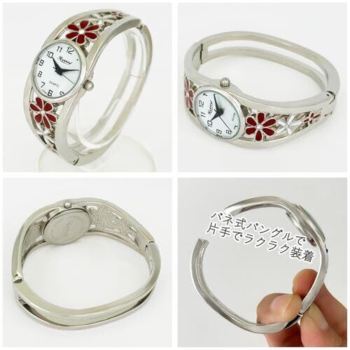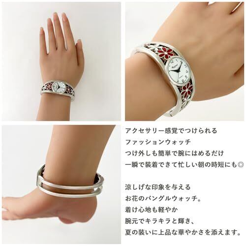 お花が可愛い涼しげなバングルウォッチ 着脱簡単ワンタッチで忙しい朝にもお手軽におしゃれ度をアップさせます 日常生活用防水(3気圧防水) 精度が高い安心の日本製ムーブメント セット内容:本体、取扱説明書、保証書同梱