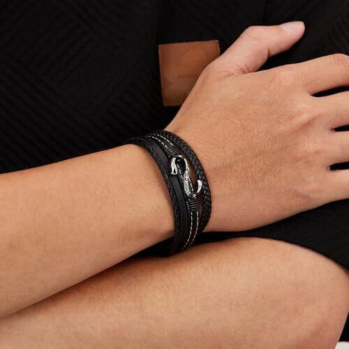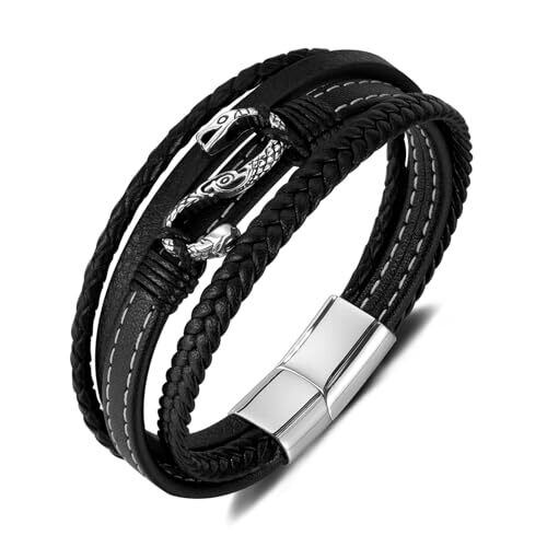 [Rockyu] ブレスレット メンズ レザー ブラック 多連バングル 編み込み 蛇のモチーフ ステンレス 金属アレルギー対応 カジュアル おしゃれ アクセサリー