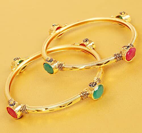 タッチストーンインディアンボリウッドデザイアトレンディなエスニックオーバルシェイプフェイクルビーエメラルドスタイル定義デザイナージュエリーバングルブレスレット2個セットゴールドトーン女性用。