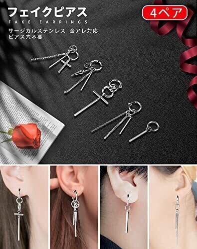 【4種の人気イヤリング メンズ】ピアス穴なしでもオシャレに楽しめるイヤリングメンズです。ピアスセットにはシンプルなスティックの揺れるイヤリング、3本のスティックをまとめたフープピアス、2本のスティックとチェーンが付いたイヤリング、チェーンやスパイク、クロス、スティックが付いたフェイクピアス など合計4タイプが含まれています。イヤリングをペアでつけたり、片耳だけ付けたり、重ね付けたり、軟骨ピアスとして付けたりして1色々な付け方法があり、通常のフープイヤリングに飽きてしまった方にとてもオススメなアクセサリーです。