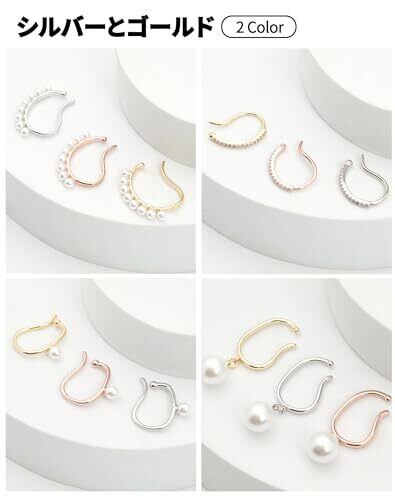 【種類豊富な4ペアイヤーカフレディース】パールモチーフが特徴のイヤーカフセットです。カラーバリエーション:シルバー、ゴールド、ピンクゴールドで、ピアス穴がなくてもOK、耳たぶに挟むだけで簡単に装着可能!4ペア(8点)セットなので重ね付けや両耳に付けたりなど、お好みに合わせて自由なアレンジをお楽しみいただけます。 【人気のイヤーカフパールセット】4種類のデザインが各2個ずつセットになった8点セットです。8つ入っているので色々な組み合わせが楽しめ、装着時に広げたり閉じたり出きるので外れにくいです。ユニセックスデザインの人気両耳イヤカフセットで、耳に穴を開ける必要がなく、耳への負担もなく長時間つけていても疲れにくい上、金属アレルギーの方にもご利用いただけます。