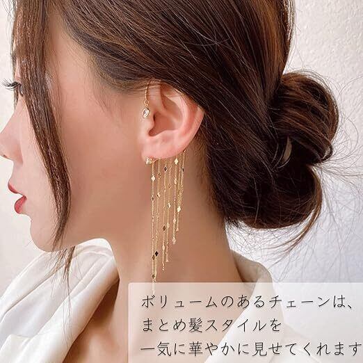 ピアス穴不要・ノンホール仕様 耳に引っ掛けるだけで簡単装着。ピアス穴がない方でも安心して使えるイヤーカフです。締め付け感が少なく快適。 片耳用・存在感のあるロングデザイン 片耳だけでコーデの主役になるデザイン。縦ラインを強調し、フェイスラインをすっきり見せます。 ブラックビーズ×ゴールドの大人配色 ゴールドチェーンにブラックビーズを組み合わせ、甘すぎない上品でクールな印象に。 多連チェーンの揺れ感 長さの異なるチェーンが動くたびに揺れ、横顔や後ろ姿まで美しく演出。写真映え◎。