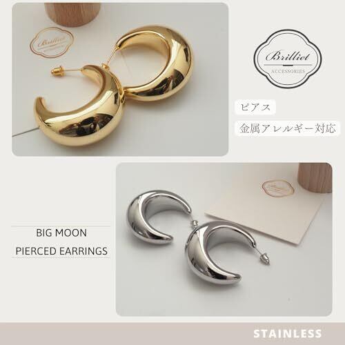 【目を引く印象的なデザイン】 コロンとした立体感が魅力の大きな月型ピアスは、個性を引き立てる存在感抜群のアイテムです。シンプルな服装にも華やかさをプラスし、様々なスタイルにお使いいただけます。カラーはゴールドとシルバーの2色展開です。 【上品な輝き、ユニークな形】エレガントでありながら遊び心も感じさせるユニークなデザインが魅力をプラスします。大きなデザインが目を引き、周囲の視線を集めること間違いなしです。 【プレゼントにも】 自分へのご褒美や、誕生日、クリスマス、ホワイトデー、記念日などに、恋人や友達への贈り物やプレゼントにおすすめです。