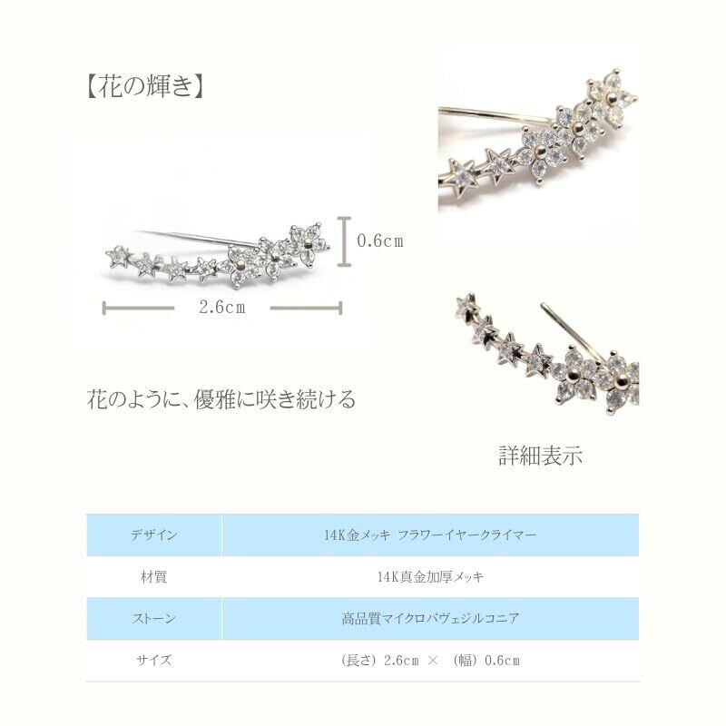 Seraphina Gems(セラフィナ・ジェムズ)は、「光」と「守り」をコンセプトに誕生しました。 日常に寄り添うジュエリーとして、控えめながらも上品なデザインを大切にし、 お召しになる皆様の毎日に、小さな「特別なひととき」をお届けします。 【商品ポイント:耳元に咲き誇る、華やかな花々の輝き】 耳のラインに沿って流れるように配置された、愛らしい花々のデザイン。高輝度なジルコニアを贅沢に敷き詰め、お顔周りをパッと明るく華やかに彩ります。繊細な輝きが、普段使いからパーティーシーンまで、女性らしさを引き立てる特別なアクセントになります。