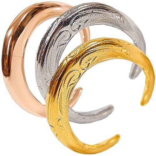 ※片耳1個売りなります。両耳が必要な方は数量2でご注文をお願いします。 使用貴金属:サージカルステンレス316L 縦:約25.0mm 横:約22.0mm 厚み:約2.0mm スクロール(波)をモチーフにしたデザインと、シンプルな鏡面仕上げのデザインから選べるフープイヤーカフです。大き目サイズで存在感のある月形のフープは、約13号のリングとしてもご利用いただけます。お手持ちのピアスや指輪と合わせて重ね付けにもオススメです。