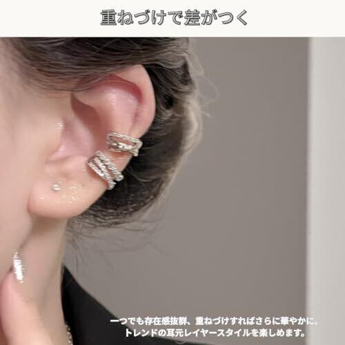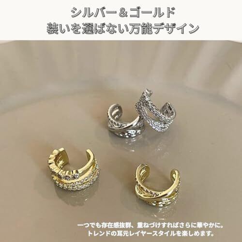 【ピアスホール不要】ピアス穴がなくても耳元のおしゃれを楽しめるイヤーカフ。挟むだけの簡単装着で、耳たぶや軟骨など好みの位置にフィットします。 【上品な2連デザイン】繊細なラインストーンが輝くツイストデザイン。光の角度によって表情が変わり、横顔を華やかに演出します。 【痛くなりにくい快適フィット】軽量素材を採用し、長時間の着用でもストレスフリー。しっかりホールドしながらも痛くなりにくい設計です。 【シルバー&ゴールド展開】シルバーは洗練された印象に、ゴールドは上品で華やかに。デイリーにも特別な日にもぴったりな万能カラー。