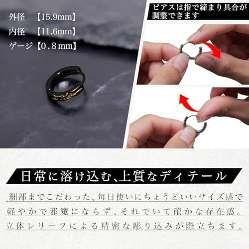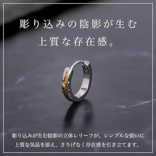 【素材&サイズ】 医療用サージカルステンレス316L。外径15.9mm・ポスト太さ0.8mm 【金属アレルギー対応ピアス】 医療用グレードのサージカルステンレスを採用。ニッケルの溶出を抑え、汗や水、海でも錆びにくく変色しにくいため、シャワー中もつけっぱなしで使用できます。金属アレルギーが心配な方でも安心です。 【立体レリーフデザインのメンズフープピアス】 シンプルながら力強さを感じさせる立体的な彫り込みが特徴のフープピアス。片耳でもしっかりと存在感があり、コーデに程よいアクセントをプラスするメンズ向けリングピアスです。