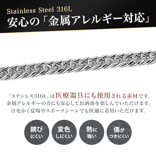 【まるでハイジュエリーのステンレス316Lネックレス】「ステンレス316L」は医療器具目的で作られているためとても安心。金属アレルギーの方でもおしゃれを気軽に楽しむことができます。 《 商品詳細 》●スペック サイズ:全長約:60cm 幅:約4.2mm / 厚み:約1.5mm / 重量:約14g(同型PTキヘイ重量約35g) ●カラー プラチナカラー ●地金/素材 ステンレス316L ●付属品 オリジナルBOX ”錆びにくく変色も少ない”ため、汗をかいてもかぶれない、かゆくならないことが多く、スポーツや「 つけっぱなし 」にされたい方にも人気。女性だけでなく男性にもおすすめです。" ノンアレルギー "対応の「 アレルギーフリーネックレス 」として、ジュエリースタジオ プラスターの【 フリーレーベルコレクション 】
