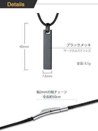 【スティック ペンダント】シンプルなスティックスティックタイプのネックレスです。メンズネックレスの定番のデザインになります。金属のボディは光の反射により輝きを放ち、先端部分のエッジを効かせたデザインが高級感を演出します。胸元から魅せるスティックペンダントは男性の持つ力強さを極限まで際立たせてくれます。シンプルでおしゃれなネックレスは流行に流されないデザインですのでファッションを選ばず着用できます。。 【紐チェーン&ステンレスチェーン】ネックレスチェーンは二つタイプがあり、お好みに選べます。幅2mm×長さ55cmの革紐、幅2.5mm×長さ50cm+5cmアジャスターのステンレスチェーン、それぞれ計6種類ご用意しております。お気に入りの商品が見つかるため、幅と長さを自由に選べます。メンズが幅と長さの違いによって、その日のスタイルに合わせて、自由にアレンジを楽しんでください!