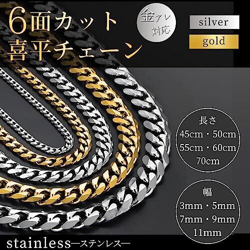 ✅【6面カット喜平チェーンネックレス】チェーンの輪を90度ひねることにより全ての輪が正面を向き、密度を高くし千切れにくい耐久性のあるネックレスチェーンです。喜平チェーンの持つ重厚感と存在感は年齢層を問わず昔から愛される人気かつ定番のネックレスです。カットは匠の技が光る6面カットを採用。カット面が多いほど光を反射するので、一般的な2面カットやカットなしと比較すると華やかな輝きを放ちます。 ✅【金属アレルギー対応のステンレス製】ステンレスは金属アレルギーの心配が少なく、錆びにくく傷つきにくい素材です。その耐食性の高さから、お手入れが簡単で美しい輝きを保つことができます。また、耐熱性にも優れており、一般的には約500℃程度まで耐えることができます。さらに、サビに強くお風呂や雨の日でも安心して使用できます。金属アレルギーの方にとっても安心な素材ですので、普段使いのアクセサリーとして24時間着けっぱなしでも問題ありません。