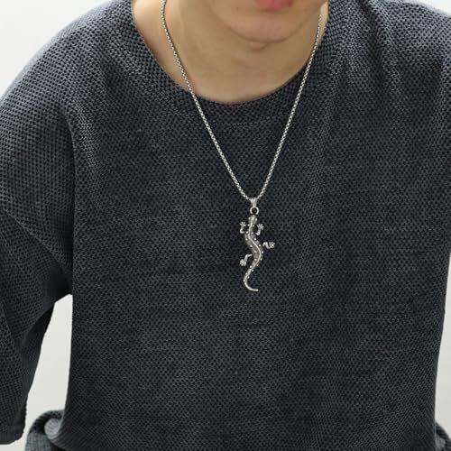 【象徴的なトカゲネックレス】「トカゲ(蜥蜴)」は、環境への適応力や変化を象徴する動物として世界中で知られています。本商品は、しなやかな曲線と精巧なディテールでリアルにトカゲを表現し、持ち主の柔軟性や進化する力を内面から引き出す意味を込めたアクセサリーです。 【Rockyu ネックレス】トカゲモチーフペンダント メンズ ステンレス製。ペンダントサイズ:縦73mm×横30mm、重量:40g、チェーン長さ:55cm。金属アレルギー対応のステンレス素材を使用し、立体的な質感と彫刻風のディテールが目を引きます。カラーはシルバーとゴールドの2色展開。