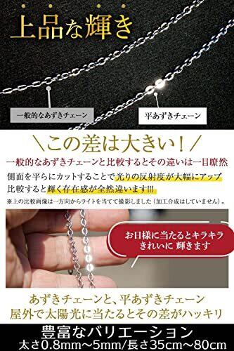 【引っ張っても切れにくい ネックレス チェーン 】一般的なネックレスチェーンはチェーンと金具を接続している丸カンが開いて切れやすい問題がありましたが、ナビストの ネックレス チェーン は丸カンの接合部を溶接することで強い力が加わっても切れにくく当社実験で約4倍の強度を持っていますのでより長くお使い頂けます。 【キラキラ輝く平あずきチェーン】Napistの あずきネックレスチェーン は 上品に輝くワンランク上の平あずきチェーンを採用しています。あずきチェーンは各ピースの向きが交互に連なりますが、その各ピースが一般の丸型よりも両面を平らにカットしている平あずきの方が光を受けてキラキラと輝きます。またあずきチェーンは各ピースの隙間がほど良い抜け感を演出し派手過ぎずない上品さを醸しだしてくれます。トップを着けずチェーンだけでもおしゃれなチェーンです。