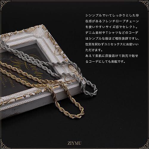 ★サージカルステンレス316L製のZIYMUフレンチロープチェーン。 重ね着けもオシャレですし、ペンダント用のチェーンとしても活躍してくれます。 ★素材:サージカルステンレス316L ★カラー:2色( シルバー / ゴールド )、サイズ:チェーン幅 3サイズ ( 3mm / 5mm / 7mm )、長さ:3サイズ ( 約 50cm / 60cm / 70cm )、重量:約 11g 〜 77 g ★付属品:ZIYMU専用ジュエリーボックス、クリーニングクロス ★カジュアルからフォーマルまで幅広いシーンで使えるアクセサリーです。