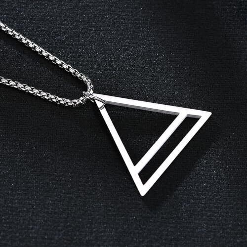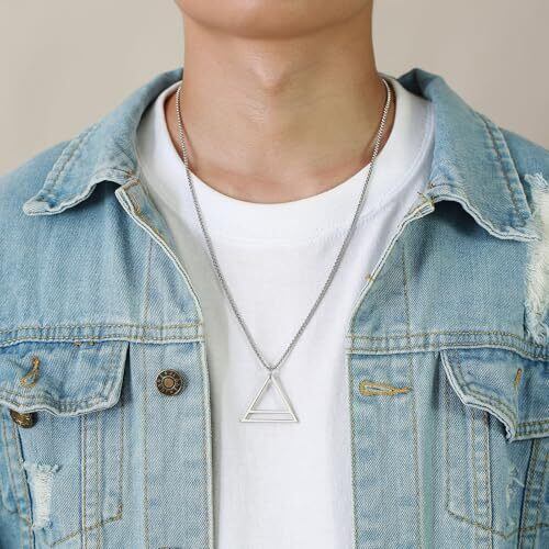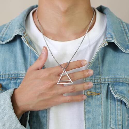 【トライアングルデザイン】 幾何学的なトライアングルデザインのペンダントが特徴のネックレスです。モダンでシンプルなデザインが、どんなスタイルにもマッチし、個性的なアクセントを加えます。 【Rockyu ネックレス】トライアングルネックレス メンズ シルバー ジオメトリックアクセサリー。素材: ステンレス。ペンダントサイズ: 34mm×30mm。チェーン長さ: 60cm。重量: 3.12g。金属アレルギー対応で、敏感肌の方も安心してご使用いただけます。 【多様な使用シーン】 このネックレスは、日常使いはもちろん、特別な日やお祝い事にもぴったりです。ユニセックスデザインなので、性別を問わずお使いいただけます。カジュアルからフォーマルまで、幅広いシーンで活躍します。
