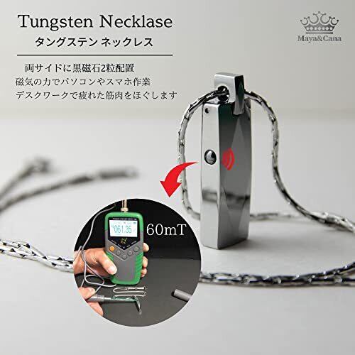 【黒磁石入り】両サイドに黒磁石(60mt)2粒を配置。磁気の力でパソコンやスマホ操作、デスクワークで疲れた筋肉をほぐします。ハードな仕事で疲れている彼氏、旦那さん、お父さんへのプレゼントにも。 【希少金属タングステンネックレス】非常に硬く強い金属タングステン。沸点は金属の中で最も高い5000度を超える強靭な希少金属です。刃物でもキズつかない高硬度のため、長年工業製品などに使用されていましたが、その輝きの美しさから装飾品でも使われるようになりました。重さは鉄の約2.5倍、金とほぼ同じで重量感もあります。