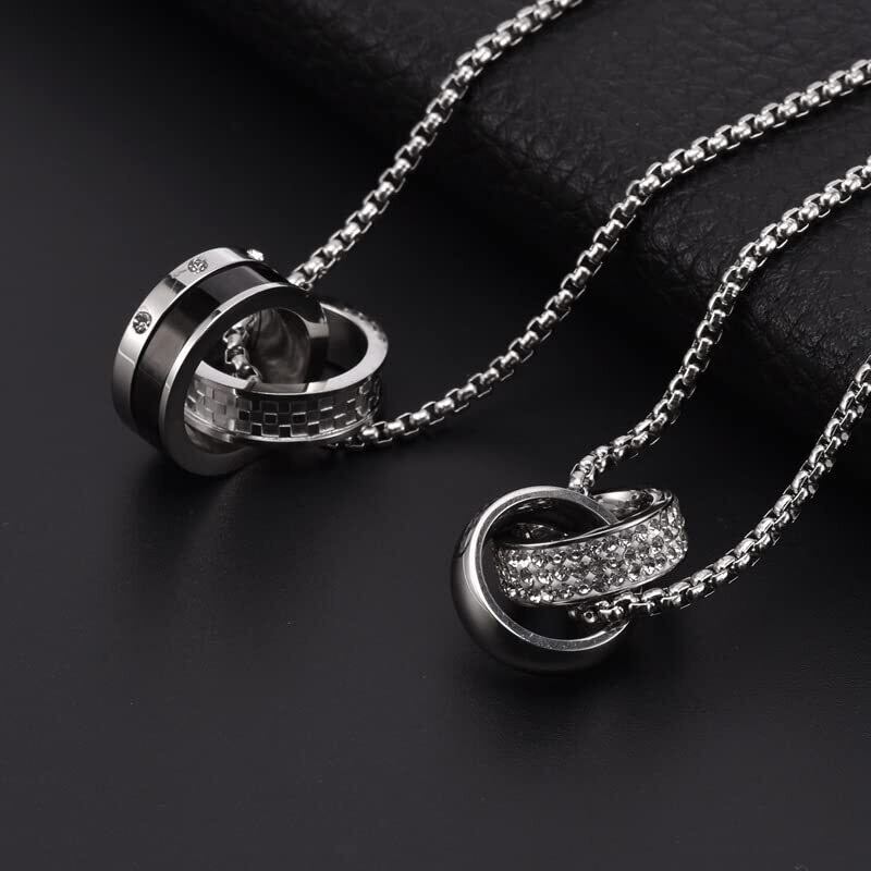 【お守りの二連リングネックレス】二つのリングが交差するデザインは「絆」「調和」「永遠の愛」を象徴し、大切な人とのつながりを身につける意味を持つアクセサリーです。 【Rockyu ネックレス】メンズ ネックレス 人気|トップサイズは約20mm×7.0mm(または17mm×6.0mm)、重量は約19〜23g。鏡面とテクスチャの組み合わせが美しく、金属アレルギー対応のステンレス素材で長くご使用いただけます。 【使用場面】結婚式、誕生日、母の日、披露宴、成人式、プロポーズ、エンゲージ、結婚式お呼ばれ、普段使い、春夏秋冬、オールシーズン、ホワイトデー、バレンタインデー、クリスマスなど多くの場面で活躍する。