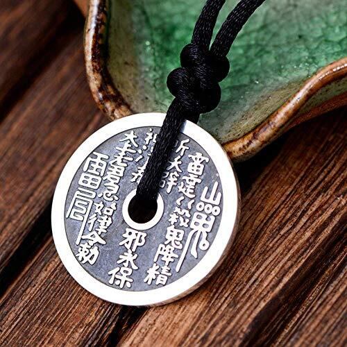 Rockyu ネックレスメンズ シルバー 円形 銅銭 コインネックレス ステンレス 文字 シンプル 山鬼雷令 魔除け 開運 お守りペンダントネックレス ブラック紐チェーン 調節可能 擬古 中華風 誕生日 プレゼント アクセサリー