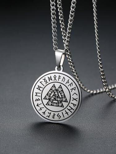 【ヴァルクヌートモチーフのペンダント】 ヴァルクヌートは北欧神話に登場するシンボルで、「戦士の魂」「勇気」「知恵」の象徴とされています。ルーン文字が刻まれたデザインは、神秘的で力強い雰囲気を演出します。 【Rockyu ヴァルクヌート ネックレス】ステンレス製 丸型ペンダント 高級感のある鏡面仕上げ 高品質なステンレス素材を使用し、耐久性と光沢感を兼ね備えたデザイン。ペンダントサイズは約25mm、重量約10.6g、60cmのロングチェーン付きでスタイリッシュな仕上がり。