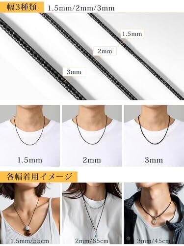 「高品質ワックスコードネックレス」ネックレスの紐にはワックスコードを採用しています。ワックスコードとは蝋引き糸・ロウビキなどとも呼ばれるポリエステル素材にワックス加工した紐です。蝋を塗ることで耐久性が上がり、水にも強くなります。革やレザーより水や汗に強い素材で色落ちの心配もないので海やプール、お風呂やスポーツなど気にせず身に着けることができます。 「豊かなバリエーション」カラーは人気のブラックをご用意しました。コードは1.5/2/3mmです。長さは40/45/50/55/60/65cmです。紐ネックレスはどんなファッションにも合わせやすく、太さや長さを変えるだけでも見栄えが違うのでコーディネートが楽しくなります。