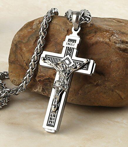 [HZMAN] カトリックJesus Christ on INRIクロス十字架ステンレススチールペンダントネックレス24 "チェーン シルバー