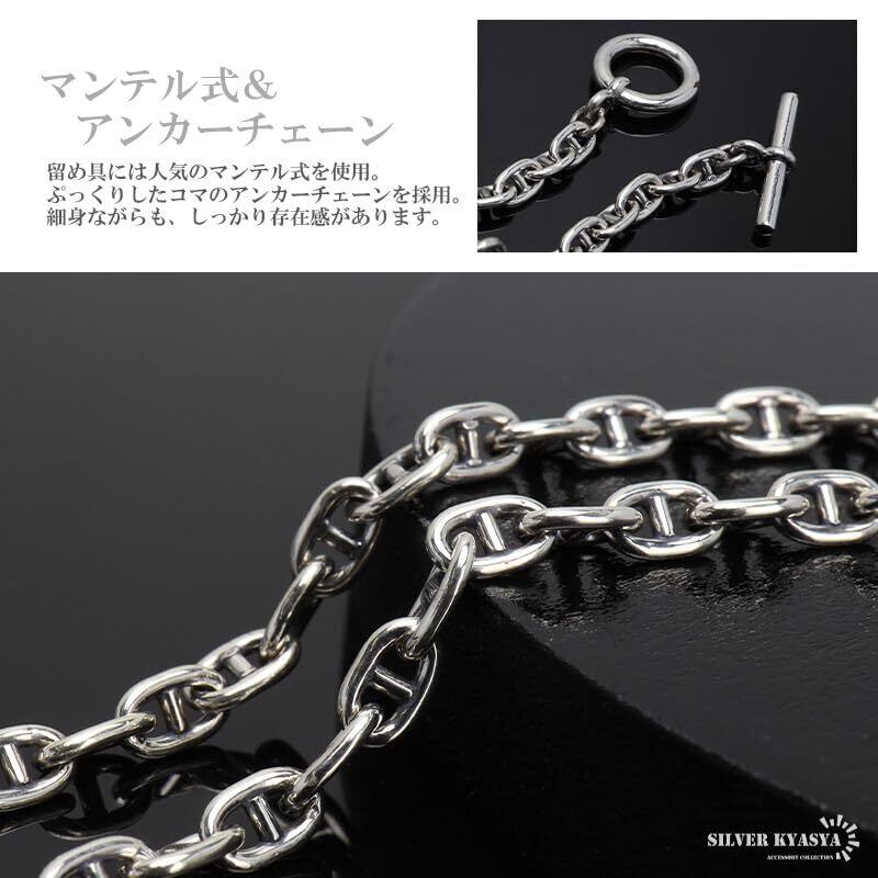アンカーチェーンをセットしたネックレス。留め具には定番のマンテル式を採用。細身ながらも、しっかり存在感があります。ファッションに取り入れやすいアイテム。 シルバー925は、銀含有率(純度)92.5%を示し、一般的に純銀として扱われています。サビや劣化等がほとんどなく金属アレルギーも出にくいとされており、アクセサリーとして重宝される金属です。 シルバー925 幅:約3.5mm、厚み:1mm、全長:50cm、総重量:12g ・SILVER KYASYA[シルバーキャシャ]当店オリジナル巾着ポーチ付属