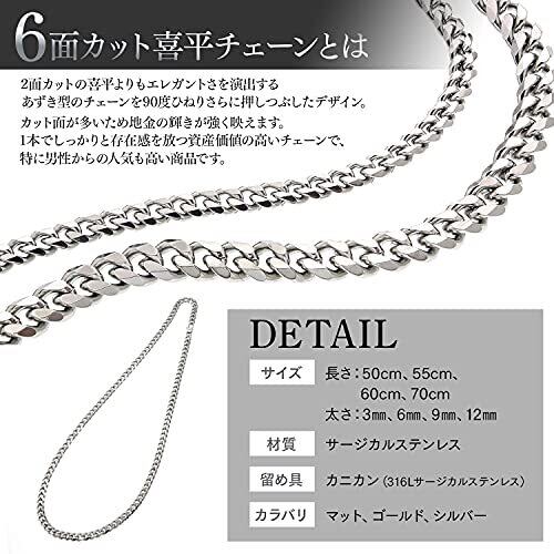 【6面カット喜平ネックレスチェーン】喜平チェーン ( キヘイ ) で最も人気の6面カットのメンズ向けのネックレスチェーンです。 6面カットなので、2面カットよりも密度が高く、隙間が少ないので反射面が多くなり輝きが増す極太ネックレスです。 【 素材を生かしたステンレス無垢 】シルバーは素材のステンレスを無垢のまま艶出し加工しております。素材のままの美しさですのでいつまでも剝がれることはありません。 【 金属アレルギー対応 アクセサリー 】材質はサージカルステンレスで、メスなどの医療用具の素材として使われる素材です。医療用に使われるぐらいですので金属アレルギーの心配も少なく、錆びにくく、傷つきにくいのが大きな特徴です。またお手入れが簡単なのも利点の1つです。