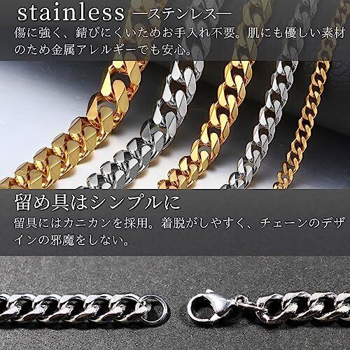 ✅【6面カット喜平チェーンネックレス】チェーンの輪を90度ひねることにより全ての輪が正面を向き、密度を高くし千切れにくい耐久性のあるネックレスチェーンです。喜平チェーンの持つ重厚感と存在感は年齢層を問わず昔から愛される人気かつ定番のネックレスです。カットは匠の技が光る6面カットを採用。カット面が多いほど光を反射するので、一般的な2面カットやカットなしと比較すると華やかな輝きを放ちます。 ✅【金属アレルギー対応のステンレス製】ステンレスは金属アレルギーの心配が少なく、錆びにくく傷つきにくい素材です。その耐食性の高さから、お手入れが簡単で美しい輝きを保つことができます。また、耐熱性にも優れており、一般的には約500℃程度まで耐えることができます。さらに、サビに強くお風呂や雨の日でも安心して使用できます。金属アレルギーの方にとっても安心な素材ですので、普段使いのアクセサリーとして24時間着けっぱなしでも問題ありません。