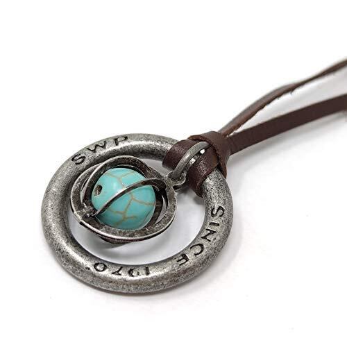 【サイズ】トップサイズ:外側リング∮29mm 内側パーツ∮15mm ネックサイズ:800mm *サイズ調節ビーズを上下してカッコいい位置に ペンダント トップを調整可能 【素材】ペンダント トップ:合成石/亜鉛合金 ネック紐:牛革 *ターコイズは合成石を使用しております。 【ターコイズ】 別名:トルコ石 仕事運 成功運の石:トラブルを回避し、仕事においては、多大な成果をもたらすと伝えられています。