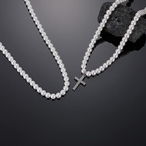 [Rockyu] ネックレス メンズ シルバー 真珠 幅6 8 10mm パールチェーン 十字架ネックレス ジルコニア キラキラ クロスペンダント チタン製 金属アレルギー対応 友達 誕生日 パーティー ファッション アクセサリー