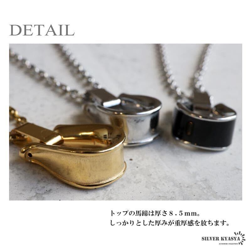 ”馬の蹄”をかたどったホースシューモチーフのネックレス。厚みのあるトップが魅力的!アクセントに丁度良く、首元で存在感を放ちます。 頑丈でお手入れも簡単なステンレス製アクセサリー。錆びることもなくサッと拭くだけメンテもかんたん。金属アレルギーが出にくいのもポイントです。 ステンレス、ゴールドタイプは18KGP 馬蹄:縦約21mm、横最大約15mm、幅約8.5mm、小豆チェーン:幅約2.5mm、全長約50cm、総重量:約13g(ゴールドタイプ計測) ・SILVER KYASYA[シルバーキャシャ]オリジナルポーチ付属