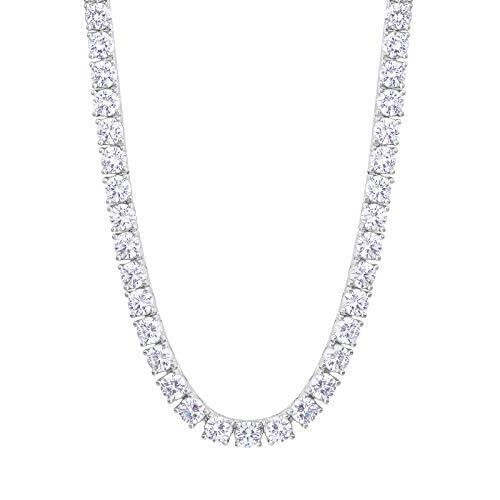 【存在感抜群の一品】幅5mmのCZダイヤストーンを80粒以上配置したラグジュアリーなテニスネックレスです。リッチな印象を与えるテニスチェーンは単体でも存在感抜群の一品。定番チェーンに物足りなさを感じている人にぜひお勧めです。 【手作業による爪留め】5A等級の大粒CZダイヤを使用することで、通常のテニスチェーンより輝きが増します。ストーンは1粒1粒ジュエラー職人による爪留めセッティングのため、光の当たり具合により輝きが魅力的に変化します。安価なのり付けの品物とは異なるラグジュアリー感に溢れています。