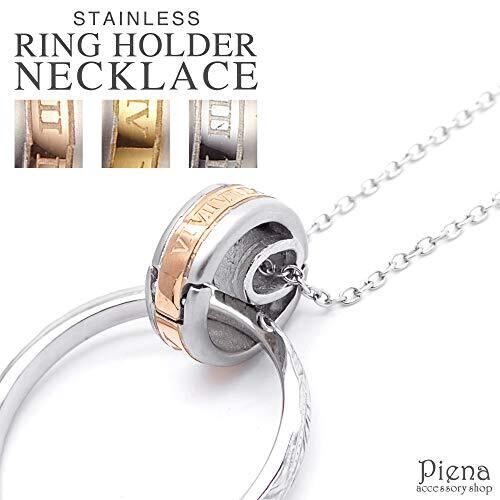 素材 サージカルステンレス PVDコーティング サイズ トップ直径:約12mm トップ幅:約4.5mm チェーン:40cm 45cm 50cm チェーンの太さ:約0.6mm 結婚指輪や ペアリング等、大切な指輪が身に着けられない時に 重宝するリングホルダーネックレスです。 ペンダントトップを開いて指輪をセットして頂くタイプですので、 指輪を落としてしまう心配がありません。 ペンダントトップはツートンカラーになっており、 表面にはローマ数字が刻まれています。 金属アレルギーになりにくい素材、高品位のステンレス、 サージカルステンレス316Lを使用していますので、