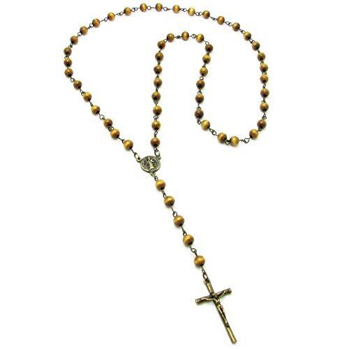 ネックレス ウッドビーズ シンプル ロザリオ クロス KN21041 (アンティークゴールドカラー)