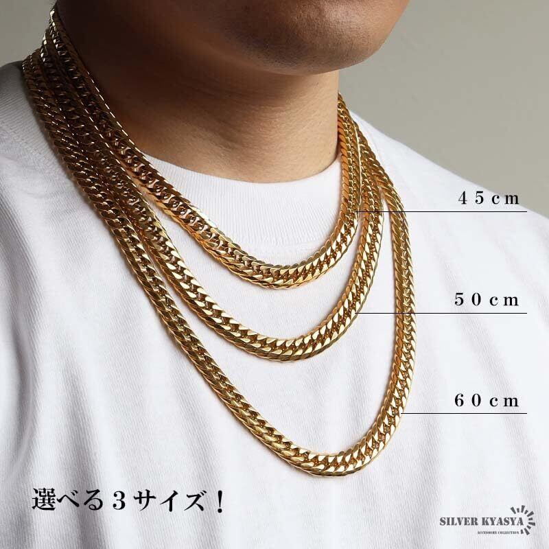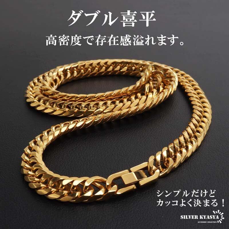 密度が濃く圧倒的な存在感が人気のダブル喜平ネックレス。6面カットの繊細な光の反射が美しいチェーンアイテムです。ステンレス製なのでつけっぱなしでも問題ございません。チェーンの長さは全3サイズからお選びいただけます。 丁度いい太さでコーデに合わせやすく、シンプルにカッコよく決まる! ステンレス、18KGP 幅:約9mm、厚み:約3.5mm、全長:約45cm/約50cm/約60cm、重量:約71g(50cm計測) ・SILVER KYASYA[シルバーキャシャ]オリジナルポーチ付属