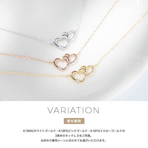 【デザイン】2つのオープンハートにダイヤモンドが一粒キラリと輝くネックレス。華奢なデザインなので首元を美しく演出してくれます。 【Made in JAPAN】ブライダルジュエリーとして妥協なき品質を追求し、長い歴史と技術を持つ日本のアトリエ(工房)にて熟練クラフトマンによりひとつずつ丁寧に製作しております。ダイヤモンドや素材、デザイン、つけ心地までご満足いただける品質のネックレスをご用意しております。 【宝石種類】 天然ダイヤモンド(ラウンドブリリアントカット) 0.01ct 【 サイズ 】ペンダントトップ:タテ約6.7mm ヨコ約10.0mm、ネックレス:約40cm(約3.0cmアジャスターカン付き) 【素材】K18WGホワイトゴールド