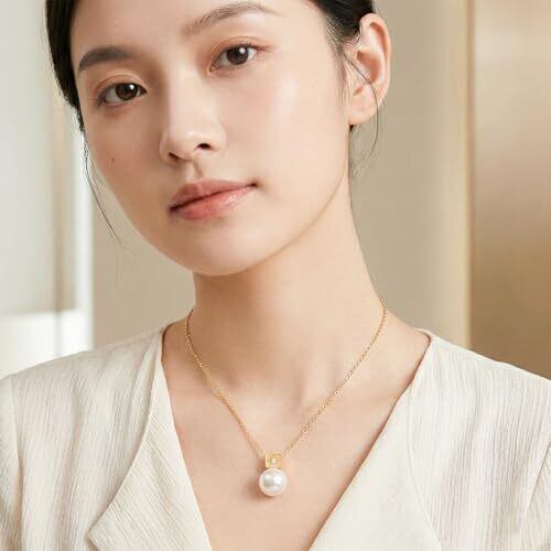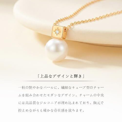 【洗練された上品なデザイン】 このネックレスは、シンプルながらも存在感のある大粒のパールと、スタイリッシュなキューブ型のゴールドチャームを組み合わせたデザインが特徴です。チャーム中央で繊細に輝くストーンがデコルテを華やかに彩り、女性らしいエレガントな印象を演出します。 【最高品質のテリと輝き】 このネックレスには、厳選された光沢の美しいパールを使用しています。鏡面のように滑らかな輝きと、肌馴染みの良い温かみのあるカラーが、お顔周りをパッと明るく見せてくれます。本物志向の方にもご満足いただける、質感にこだわったネックレスです。