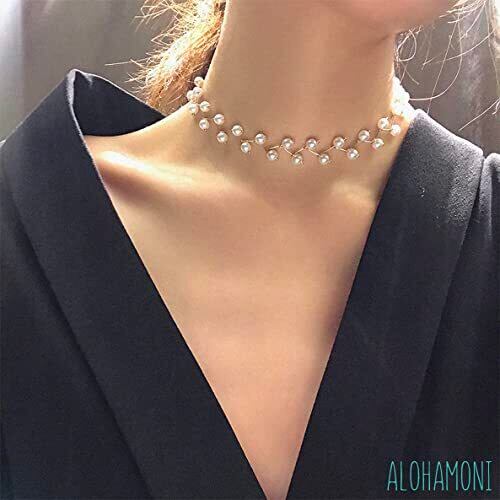 ALOHAMONI (アロハモニ) パール チョーカー ネックレス ジグザグ ワイヤー 2連デザイン 真珠 長さ調節可能 チェーン アジャスター 長さ28cm + アジャスター10cm (ゴールド)