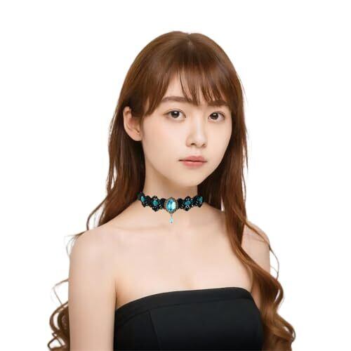 [NazyJnn] レース チョーカー ネックレス サファイア 宝石付き ゴシック ロマンティック ビンテージ チョーカー ハロウィン アクセサリー 女性用