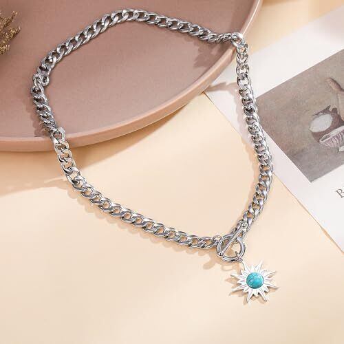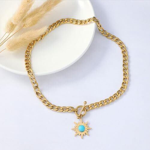 【太陽ペンダントネックレス】 太陽をモチーフにしたデザインと中央のターコイズが特徴的なネックレスで、上品かつ華やかな印象を与えます。 【Deelfel ネックレス】太陽ペンダントネックレス レディース ゴールド 18k 喜平チェーン 素材: ステンレス、18kゴールドメッキ、ターコイズ チェーン長さ: 47cm 重量: 約41g 金属アレルギー対応 【使用場面】 記念日、誕生日、クリスマス、バレンタインデー、日常使いなど、さまざまなシーンでお使いいただけます。特に大切な人へのギフトとしても喜ばれます。