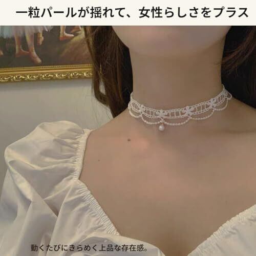 ①【上品に揺れるパールチャーム】 中央の一粒パールが、動くたびにさりげなく輝き、 上品で女性らしい印象をプラス。 シンプルな中に華やかさがあり、顔まわりを明るく見せてくれます。 ②【繊細なレースデザイン】 細部まで丁寧に仕上げられたレースは、軽やかで柔らかい質感。 フェミニンな印象を保ちながら、軽やかに首元を飾ります。 どんなコーデにも合わせやすく、季節を問わず活躍します。 ③【調整可能なアジャスター付き】 約30〜35cmの範囲でサイズ調整が可能。 首の太さに合わせてしっかりフィットし、ズレにくい設計。 金属アレルギーに配慮した素材を採用し、安心してお使いいただけます。