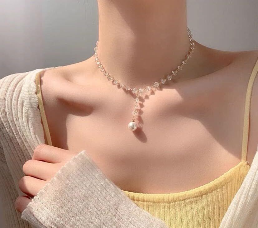 【パールチョーカーネックレス】【軽量】 一粒パール 短めネックレス 韓国風 クリスタル風 かわいい【ジュエリーケース付き】