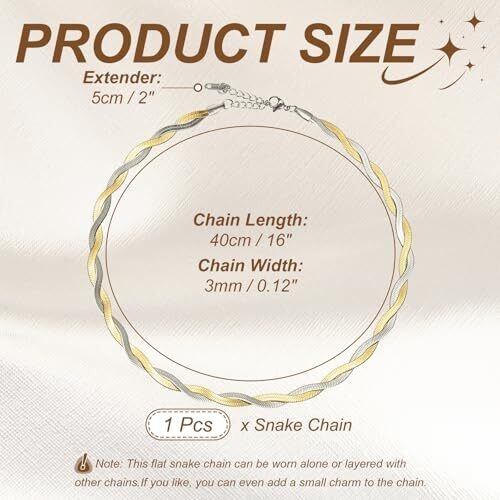 このねじれたヘリンボーンチェーンは、伝統的でシャープな高きゅう感あふれるデザインです。繊細にねじれたチェーンが美しいレイヤ ード効果を生み出し、どんなスタイルにも洗練された上品さをプラスします。シンプルなTシャツにも、ドレス アップしたスタイルにも合わせやすく、パーティー、結婚式、式典、卒業式、デート、旅行など様々な情景で活躍します。 カラー: シルバー/金色, 素材: ステンレススチール, サイズ: 幅3 mm、長さ40cm(エクステンダー5cm付き), 内容物: スネークチェーンネックレス 1個。