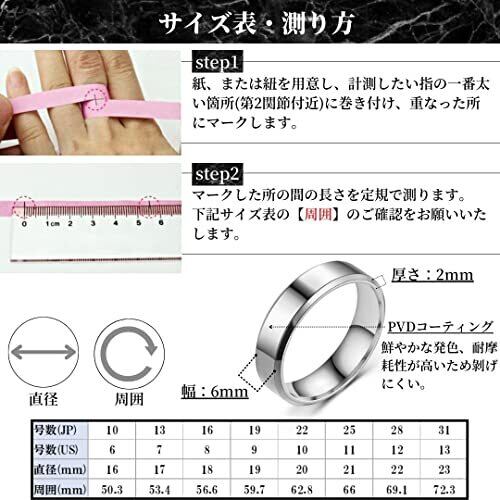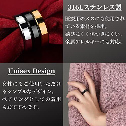【人気のシンプルデザイン】シンプルな平打ちデザイン。指輪の幅のサイズは6mm。大きすぎず、小さすぎないサイズのため、オフィスカジュアルから普段使い、結婚式、パーティーなどのドレスアップスタイル、様々なシーンでご使用いただける人気のファッションリングです。またユニセックスデザインのため、男性にも女性にもおすすめです。 【選べる3color】指輪のカラーはシルバー、ゴールド、ブラック、人気の3色からお選びいただけます。複数のカラーを重ね付けすることで、より華やかな印象を演出することが可能です。また、表面に強固なコーティングを作るPVDコーティングにより、剥げにくく、鮮やかな輝きを長く保持することが可能です。 【金属アレルギー対応】素材は手術用のメスにも使用されている、316Lサージカルステンレス製を採用。金属アレルギーの原因となるニッケル、コバルトを含まないため、金属アレルギーの方でも安心してご使用頂けます。また、傷つきにくく、錆びにくい素材のため、長くご愛用頂けます。 【サイズ】10号(US6)、13号(US7)、16号(US8)、19号(US9)、22号(US10)、25号(US11)、28号(US12)、31号(US13)からお選び頂けます。※サイズ詳細は商品ページの「サイズ表・測り方」の参照をお願いいたします。