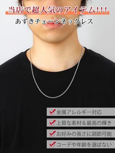 [あずきネックレス] 大人気の小豆チェーンネックレスです。シンプルなデザインなのでメンズ、レディース問わずご使用いただけます。メンズネックレス、レディースネックレス、ペアネックレスとしてもお使いいただけます。 [チェーンネックレス] ネックレスチェーンの幅は2mmで、チェーンの長さは35cm、40cm、45cm、50cm、55cm、60cm、65cm、70cmの8種類をお選びいただけます。 アジャスターが付いているので、+5cmの間でお好みの長さに調節ができます。 [ステンレスネックレス] 素材には、316Lサージカルステンレスを使用していますので、着けっぱなしにしていたり汗をかいても痒くならなく、金属アレルギーの方にも安心してご使用いただけます。 [ペンダントとの相性が抜群] バチカンの縦幅は3.3mm以上のペンダントに取り付け可能です。重ね付けや、お手持ちのペンダントトップを通して楽しむのもおすすめです。 [通常梱包] 商品は専用のお箱に入れてお届けしますので、ギフト用としてもお使いいただけます。お誕生日プレゼントや結婚記念日の贈り物としてはもちろん、クリスマスギフト、ホワイトデーのお返し、母の日、出産祝いなどのギフトに最適です。