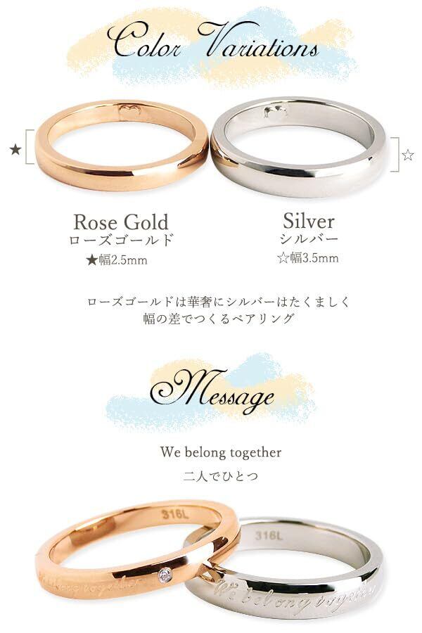【サイズ】ローズゴールド:幅2.5mm/シルバー:幅3.5mm 【素 材】サージカルステンレス/ジルコニア(ローズゴールドのみ) 【リングサイズ】ローズゴールド11号 & ステンレスシルバー19号 【表面メッセージ】We belong together (二人でひとつ)※表面のメッセージは変更できません
