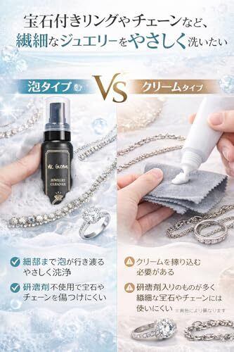 くすんだジュエリー、買った時の輝きへ。 MKGLOBAL ジュエリークリーナーは、 ご家庭で簡単に使える 貴金属専用の艶出しクリーナーです。 シルバーの黒ずみ、ゴールドのくすみ、 日常使用で失われた輝きをやさしく磨いて回復します。 ✔ 専門工具不要 ✔ 初心者でも簡単 ✔ おしゃれなパッケージでプレゼントにも 特徴(箇条書き) ・泡タイプでムラなく洗浄 ・やさしい非毒性処方 ・日常使いに最適 ・金・銀・銅に対応 使用方法 1. 泡をジュエリー全体に直接均一に塗布してください。 2. 柔らかいブラシや布でやさしく洗ってください。 3. 水で十分にすすいでください。 4. 付属のクロスで水分を拭き取り、さらに磨いて仕上げてください。 5. 泡タイプのため、使用後にノズル先端に液が残る場合があります。気になる場合は軽く拭き取ってください。