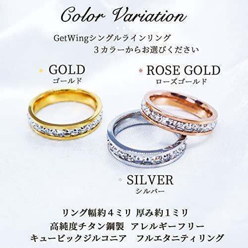 【高研磨鏡面仕上高純度チタン鋼リング】指輪の幅4ミリで存在感があり、軽量で強度がありサビに強く傷が付きにくい厳選された高純度チタン鋼を最新の高研磨技術で磨き上げた鏡面仕上げで力強い輝きをきらびやかにアピールします!! 【キュービックジルコニアシングルライン】高品質で限りなくクリアな輝やかしく美しい指輪に厳選されたキュービックジルコニアをふんだんに贅沢にあしらったシングルラインのストーンがゴージャス感を演出します!! 【アレルギーフリーで着け続けても安心♪】医療用にも使用される高純度チタン鋼採用により日常着け続けても安心快適な指輪です☆ 【メンズ・レディース兼用ペアリング等】メンズ・レディース兼用でシルバー、ゴールド、ローズゴールドの3カラーを取り揃えました、ペアリングやカップルリング、ピンキーリング、プレゼントにも最適な指輪です☆お誕生日 クリスマス 母の日 父の日 バレンタインデー ホワイトデー 自分へのご褒美にもいかがですか?☆ 【製品仕様】指輪:高純度チタン鋼製 ストーン:キュービックジルコニア サイズ:幅約4ミリ 厚さ約1ミリ 付属品:GetWingオリジナル布ポーチ+ミニウェス サイズ表記:日本サイズ