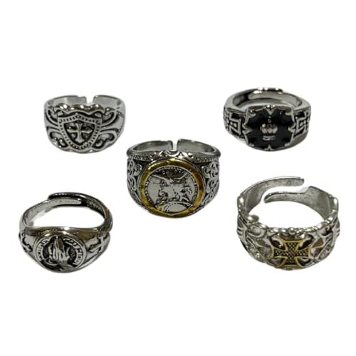 セット構成:クロス、イーグル、フェザーなど多彩なデザインのリング5点セット デザインスタイル:アメカジ、メキシカン、ヴィンテージテイストを融合したユニークなデザイン カラー仕様:重厚感のあるシルバートーン加工で統一された高級感のある仕上がり 素材特徴:耐久性のある合金素材を使用し、シルバートーン加工で上質な輝きを実現 サイズ調整:フリーサイズで着用者に合わせて内径を調整可能なデザインを採用 着用スタイル:単体使用から重ね付けまで、様々なコーディネートに対応可能